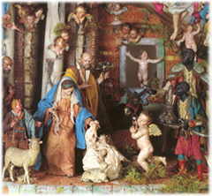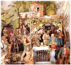 ![]() Ammirando la composizione presepiale si può notare la natività sistemata, in ossequio alla tradizione, fra ruderi di un tempio profano con il significato allegorico del trionfo del cristianesimo sul paganesimo. Inginocchiati ai piedi del Bambino sono posti lo zampognaro, il re giovane (attribuito a Salvatore Franco) e il re vecchio (1797, eseguito da Francesco Viva). Fanno da cornice alla scena, dalla sinistra, l'angelo con l'incensiere (1764, anch'esso di Francesco Viva) sormontato dall'angelo attribuito al Genzano, gli altri angeli, i puttini e i cherubini. ![]() Da notare poi la scena dell'annuncio particolarmente ricca di personaggi e animali, tutti di pregevole fattura. Nella scena della taverna si possono ammirare i due straordinari pastori, detti "sciacquanti", seduti a tavola; la donna, attribuita al Sanmartino, l'uomo attribuito al Gori. Si chiude così il corpo centrale della composizione. ![]() Sulla sinistra della taverna, tra uno stretto passaggio nelle montagne, si può intravedere il Vesuvio, presenza ricorrente nei vecchi presepi. Lungo il passaggio si notano figure tipiche ispirate al più spiccato realismo e raffiguranti la vita popolare napoletana, come la coppia di ricchi contadini, la donna recante un cesto di frutta a dorso del mulo (attr. a C. Celebrano), il pescivendolo (attr. a Francesco Cappiello), la castagnara (Attr.: Lorenzo Mosca), l'arrotino (S. Franco). |