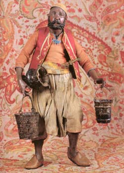 H cm 41 Attr.: Salvatore Franco Vestitura originale: giornea in seta, giubba in seta rossa con ricami, branche in tela a righe, cintura in seta a fasce. Accessori: zucchetto, coltello cm. 11 con impugnatura in metallo e fodero in cuoio, secchi in argento cesellato cm. 9, 10, 11. |