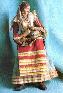 H cm 37 Attr.: Francesco Cappiello Vestitura originale: camicia bianca in batista con bordi di trine, corpetto azzurro con galloni in oro, maniche in raso rosso staccate ed annodate con nastri, pettina in laminato giallo con galloni in oro e seta, sui capelli fazzoletto di batista con bordi di trine. Accessori: un orecchino in oro, laccetto in oro, collana in turchesi, neonato in fasce con testa in terracotta policroma. |