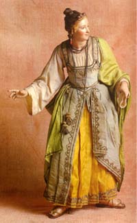 H cm 40 Attr.: Genzano Vestitura originale: camicia in batista bianca con ricami in seta, gamurrina in armesino giallo con galloni in oro, corpetto e gonna in seta azzurra gallonata e ricamata in oro, mantello in seta verde con galloni in oro e ricami in filo sul bordo. Accessori: laccio in argento, collanina in argento dorato , 2 orecchini in oro e corallo. |