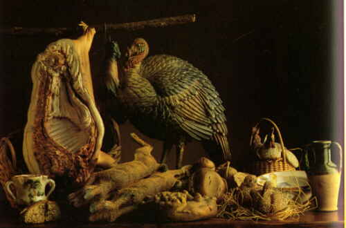 Natura morta quarto di maiale macellato, tacchino, lepri