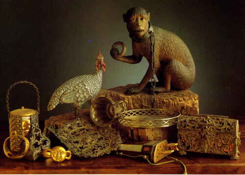 Una scimmia, una gallina faraona e argenteria