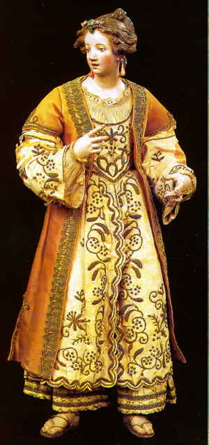 E' abbigliata in una serica veste che copre le ampie brache, percorsa da un fitto ricamo a rameggi vegetali in filo d'oro e d'argento e coperta da una lunga palandrana con simili applicazioni; indossa i gioielli di gusto semplice e raffinato in voga alla fine del secolo: pendeloques in corallo rosa e diadema in argento con perline e paste vitree. Viene assegnata alla vasta produzione di Giuseppe Sanmartino, molto interessato ai soggetti di razza orientale, come testimonia un inventario di Casa Reale che menziona gli acquisti di pastori di Francesco I fatti in vari momenti in cui sono citati diversi pastori di seguito di magi ed orientali non meglio specificati, come opera del maestro. Tra l'altro la figlia dello stesso sovrano, Maria Cristina, quando andò in sposa a Ferdinando VII re di Spagna, portò con sé il famoso Corteo dei Magi del Presepe Cinque, che le fonti riportano come opera del Sanmartino.